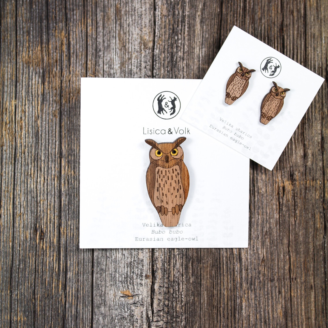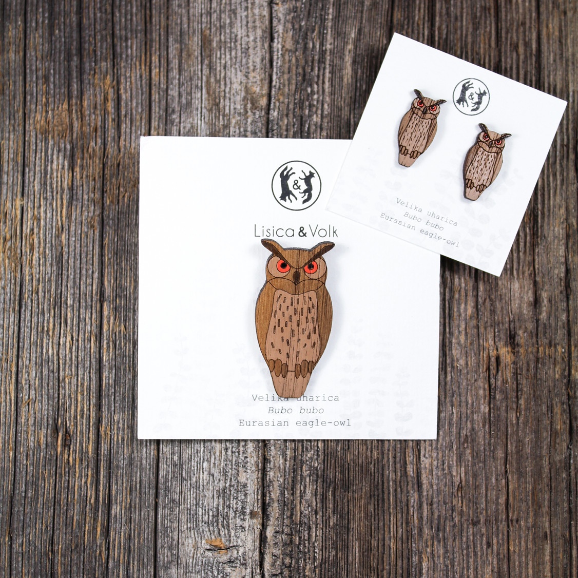 Uhani iz orehovega lesa, ročno poslikani in zaščiteni z lakom.