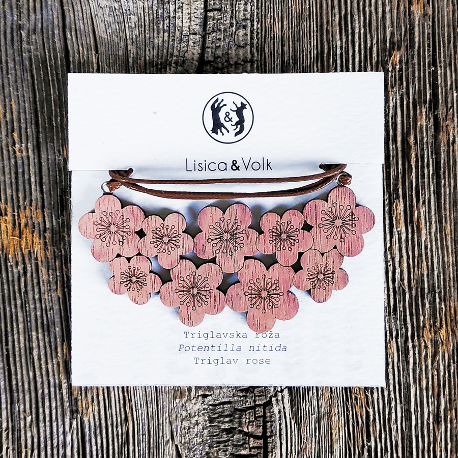 Ogrlica iz orehovega lesa, ročno poslikana in zaščitena z lakom.